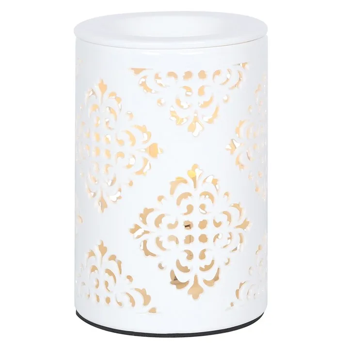 This elegant, electric oil burner lights up to showcase a detailed damask pattern and is compatible with both scented fragrance oils and wax melts. To use, place on a level and heat resistant surface before placing oil or wax melts in ceramic dish and plugging in burner. Unplug when not in use and let cool completely before moving or cleaning removable dish with warm, soapy water. Electrical safety tested. On-off switch. Class 2 equipment, European conformity, 220-240 voltage, frequency 50Hz, supplied with a 25w bulb but can be used with bulbs up to 40w. Do not use near water. Please note that the oil burner does take around 10-20 minutes to heat up fully ready to melt wax and release the fragrance. Depth of dish – 2cm. Product Dimensions: H15cm x W10cm x D10cm Packaged Dimensions: H19cm x W12cm x D12cm